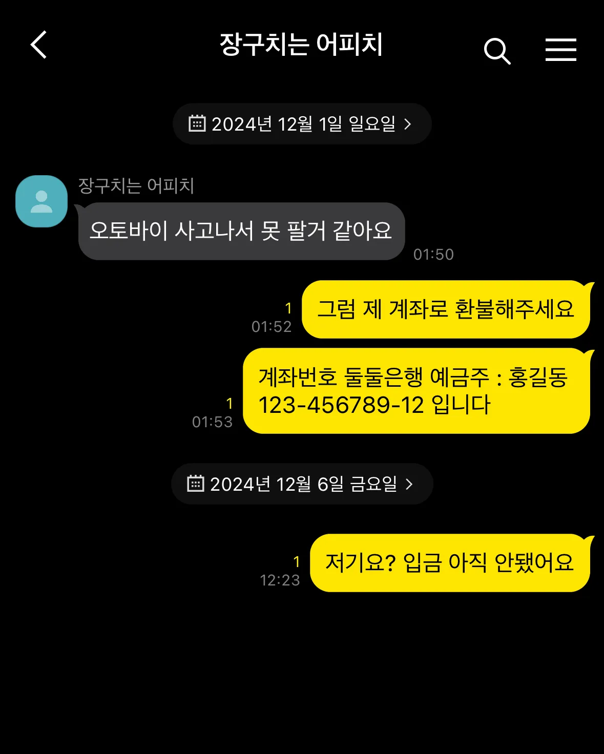 • 판매자의 연락처 및 계좌번호 정보